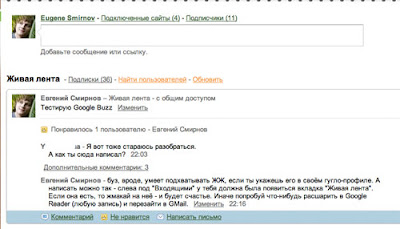 Сегодня (а у некоторых пользователей даже раньше) в GMail появилась новая опция - "Живая лента" или Google Buzz (бузя). Сам по себе сервис представляет собой некую композицию из чата + google reader + google wave.